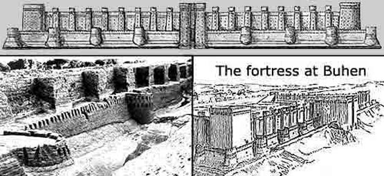 en madera y poseía un puente levadizo.Los muros interiores de la fortaleza alcanzaban un grosos de 5 metros y una altura de unos 11 metros, las torres de las esquinas reforzaban la estructura como dije antes.Buhen fue construida para defender la frontera meridional y además, así poder controlar la vía comercial que discurría por el río Nilo desde Sudán al sur de Egipto, sobre todo a partir de la dinastía IV ya que en la región había canteras de diorita y tenían que transportarse.La guarnición constaba de varias dependencias, barracas para los soldados, templo dedicado al Horus de Buhen, etc. Esta guarnición podía comunicarse con el exterior por medio de un túnel.
